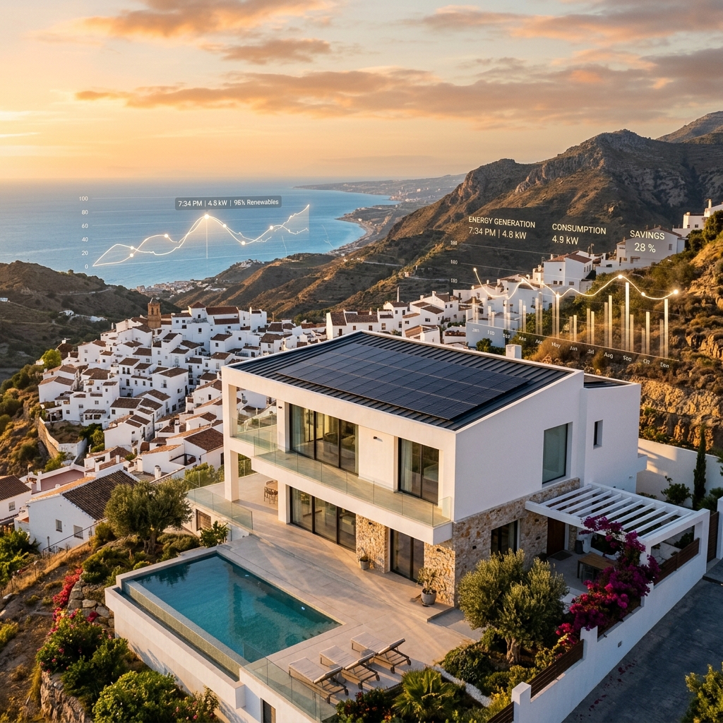 The Axarquía sees Global Horizontal Irradiation (GHI) values between 1,800 and 2,100 kWh/m2. A typical 5kWp system in Competa produces ~7,500 kWh annually. At retail rates of €0.24/kWh, this is worth €1,800/year. However, the value of that energy depends on your 'Self-Consumption Ratio.' Using a heat pump for winter warmth or A/C for summer cooling shifts your consumption to match the production curve, maximizing your direct savings.